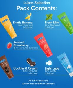 Cada paquete contiene 5 lubricantes aromatizados de alta calidad en divertidos mini tubos. Diseñado para proporcionar una lubricación duradera y reducir la fricción, asegurando una experiencia suave y cómoda. Nuestra fórmula a base de agua no es pegajosa, es fácil de limpiar y no deja residuos, lo que la hace adecuada para su uso con condones y todo tipo de juguetes sexuales, lo que garantiza una experiencia segura y agradable tanto para usted como para su pareja.
